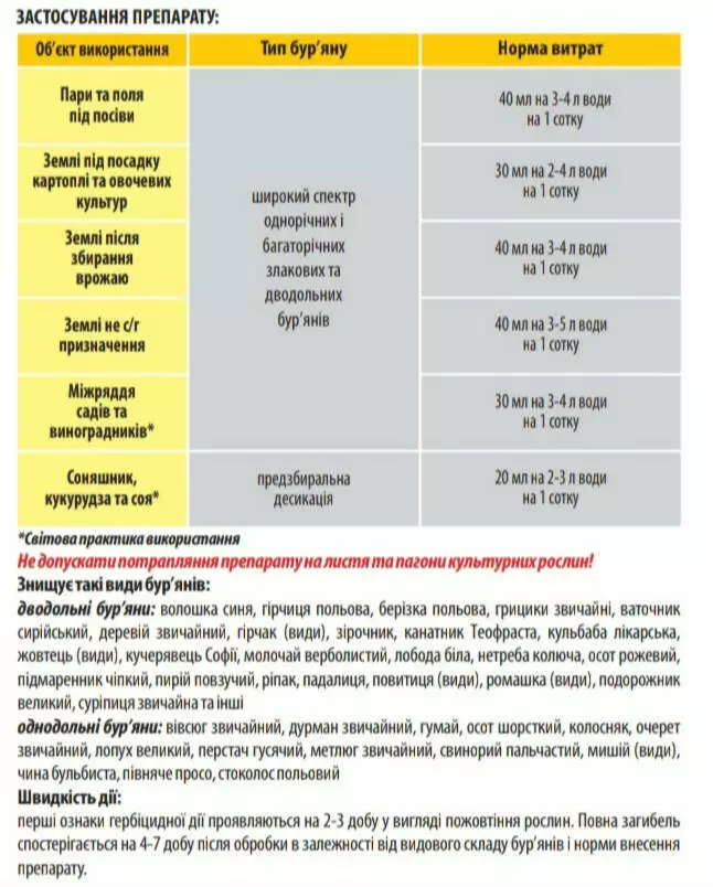 | Подсолнух, кукуруза и соя | Широкий спектр однорічних і багаторічних злакових і дводольних бур'янів | 20 мл на 2-3 л воды на 1 сотку |