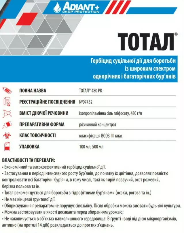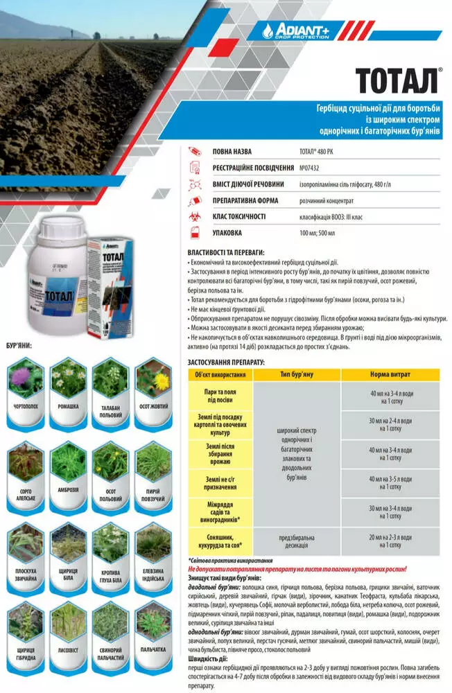 Тотал - Гербицид сплошного действия для борьбы с широким спектром однолетних и многолетних сорняков.