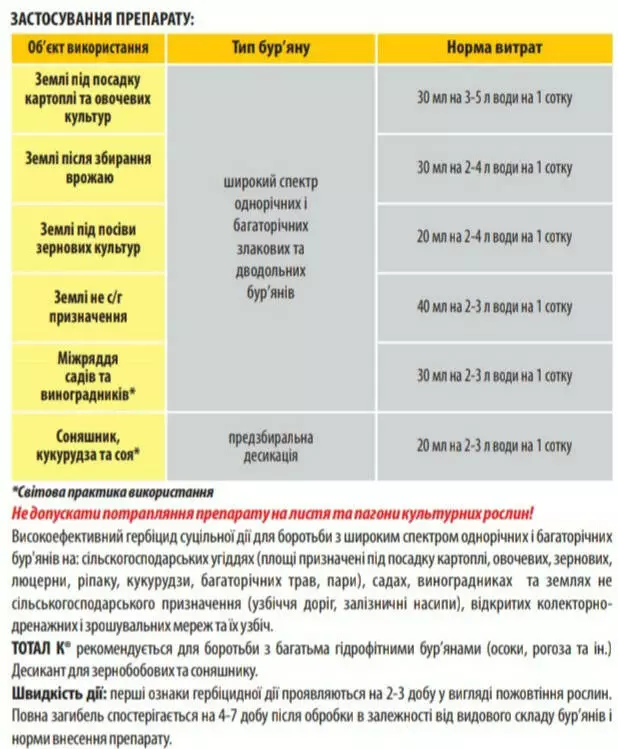 Высокоэффективный гербицид сплошного действия для борьбы с широким спектром однолетних и многолетних сорняков на: сельскохозяйственных угодьях площади предназначены под посадку картофеля, овощных, зерновых, люцерны, рапса, кукурузы, многолетних трав, пары, садах, виноградниках и землях не сельскохозяйственного назначения: обочины дорог, железнодорожные насыпи, открытых коллекторно-дренажных и оросительных сетей и их обочин. ТОТАЛ К рекомендуется для борьбы со многими гидрофитными сорняками (осоки, рогоза и др.) Десикант для зернобобовых и подсолнечника.