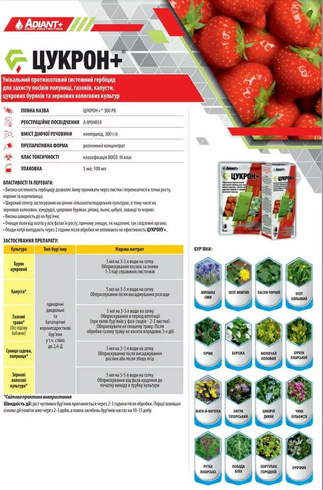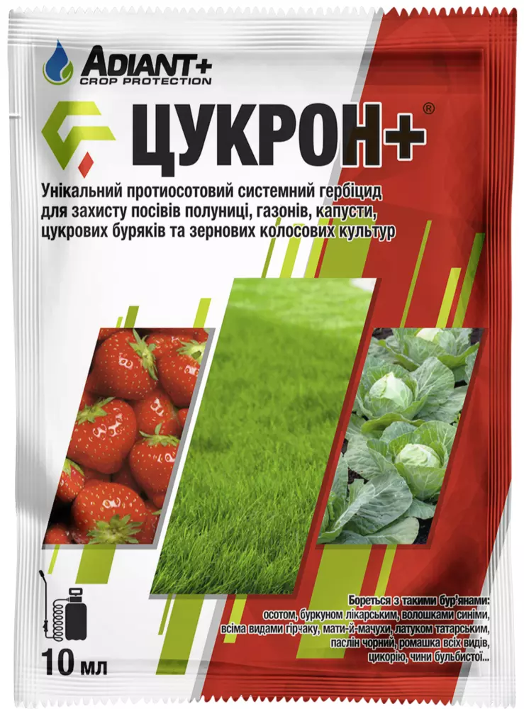 Цукрон+ - Уникальный против осота системный гербицид для защиты посевов клубники, газонов, капусты, сахарной свеклы и зерновых колосовых культур.