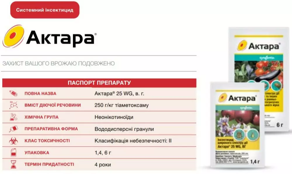 Актара - Системный инсектицид нового поколения, имеет высокую эффективность и быстро действует (в течение 15 минут) независимо от погодных условий. Актара гарантированно защищает растения в течение 24 дней, что на 6-7 дней дольше, чем другие инсектициды. Актара защищает также молодые побеги, которые появились после обработки, благодаря высокой растворимости и подвижности действующего вещества в растении. Действующее вещество препарата движется по растению только вверх (апикально) по ксилеме и не накапливается в клубнях, овощах и плодах, которые формируются с отливом пластических масс по флоэме. Препарат относится к классу малотоксичных веществ (ЛД50>5000 мг/кг).