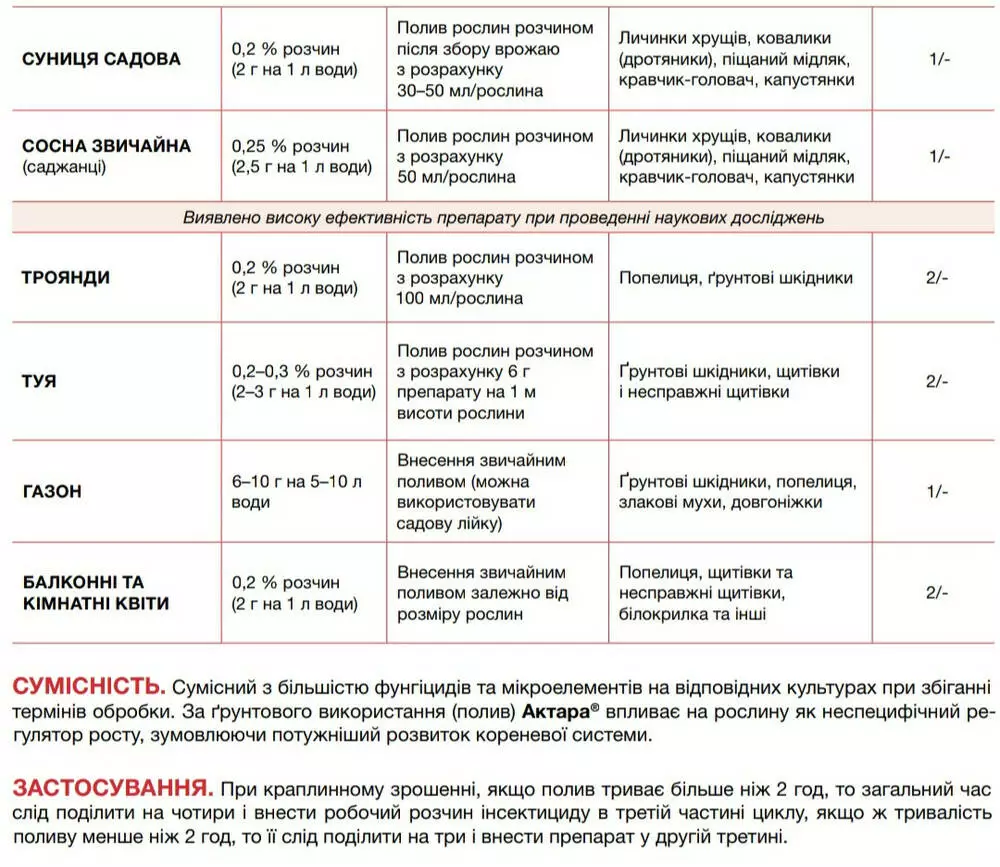 Совместим с большинством фунгицидов и микроэлементов на соответствующих культурах при совпадении сроков обработки. При почвенном использовании (полив) Актара влияет на растение как неспецифический регулятор роста, обусловливая мощный развитие корневой системы. Это стимулирующее влияние названо "вигор" - эффектом или "эффектом жизненной силы".