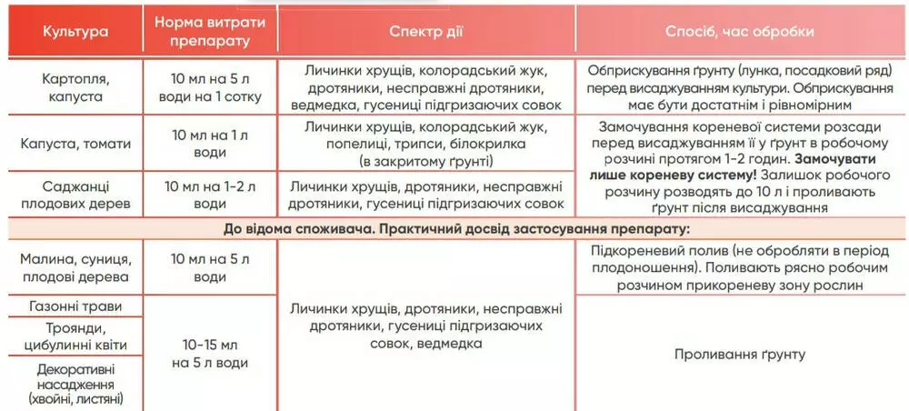 | Малина, клубника, плодовые деревья | 10 мл на 5 л воды | Личинки майских жуков, проволочника, ненастоящие проволочника, гусеницы подгрызающих совок, медведка | Подкорневой полив (не обрабатывать в период плодоношения). Обильно поливают рабочим раствором прикорневую зону растений |