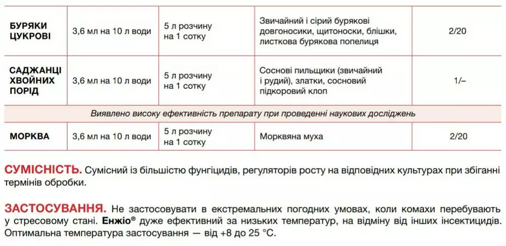Не применять в экстремальных погодных условиях, когда насекомые находятся в стрессовом состоянии. Енжио очень эффективен при низких температурах, в отличие от других инсектицидов. Оптимальная температура применения Енжио - от +8 °С до +25 °С.