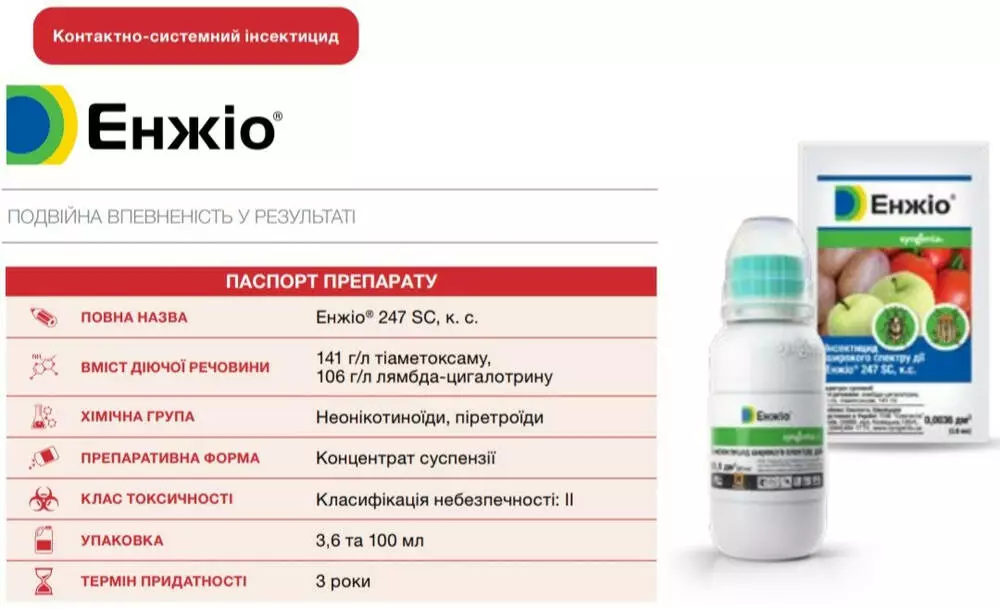 Препаративную форму Енжио изготовлено по Зеон-технологии. Это концентрат микрокапсулированной суспензии, которая продлевает действие пиретроидного составляющей препарата и улучшает термостабильность инсектицида в целом, фотостабильность и устойчивость к осадкам.
