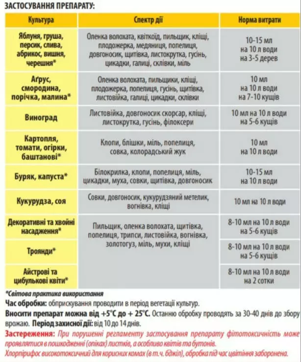 Предостережение: При нарушении регламента применения препарата фитотоксичность может проявляться в повреждении (ожогах) листьев, а особенно цветов и бутонов. Хлорпирифос высокотоксичен для полезных насекомых (в т.ч. пчел), обработка во время цветения запрещена.