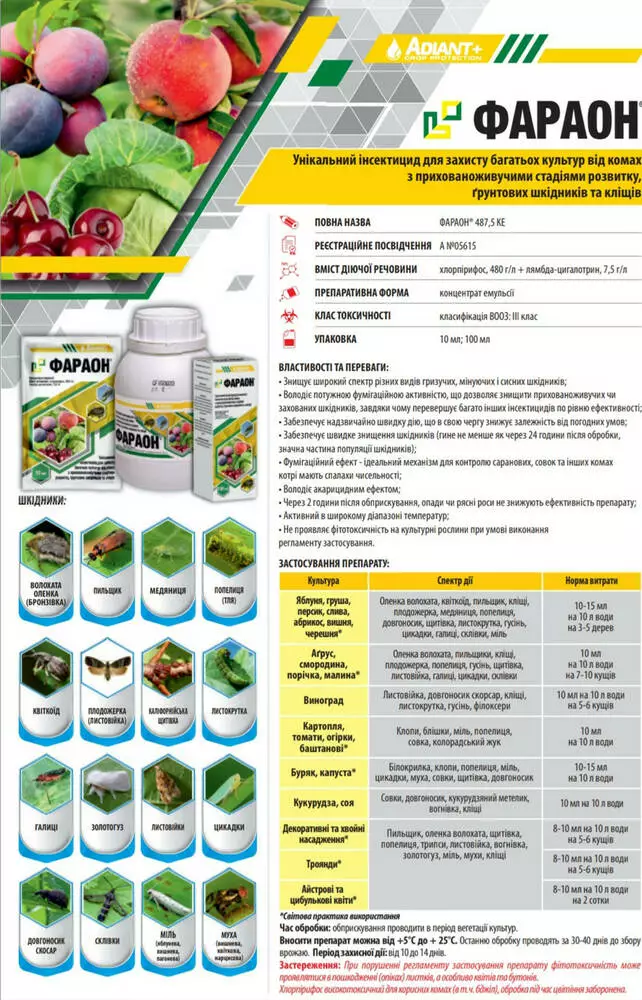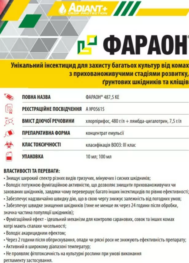 Фараон - Уникальный инсектицид для защиты многих культур от насекомых с скрытоживущими стадиями развития, почвенных вредителей и клещей.