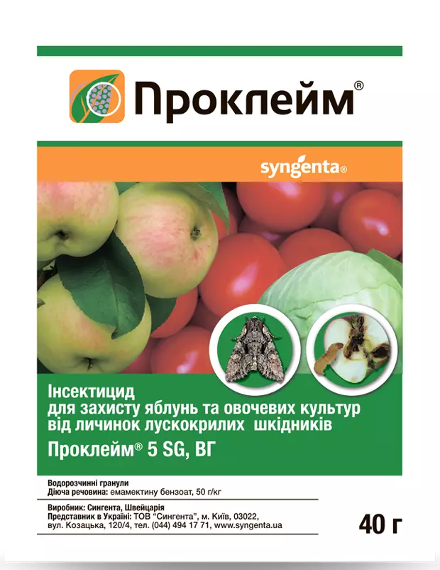 Проклейм - Новый инсектицид для защиты яблонь, овощных культур и винограда от всех чешуекрылых вредителей. Препарат быстро проникает в ткани растений (в течение 2 часов), но не имеет системного действия. Там он содержится в виде микрорезервуаров в большом количестве. Благодаря быстрому проникновению в растения эффективность действия препарата не зависит от высоких температур и осадков. Защитный период - до 2 недель. Действие препарата начинается с фазы яйца - прямое овицидное действие (при попадании на яйцекладку проникает через оболочку яйца и личинка погибает). В дальнейшем гибель личинок вредителей вызывает их питания на обработанных растениях (питание прекращается через 1-4 часа, полная гибель наступает в течение 1-4 суток).