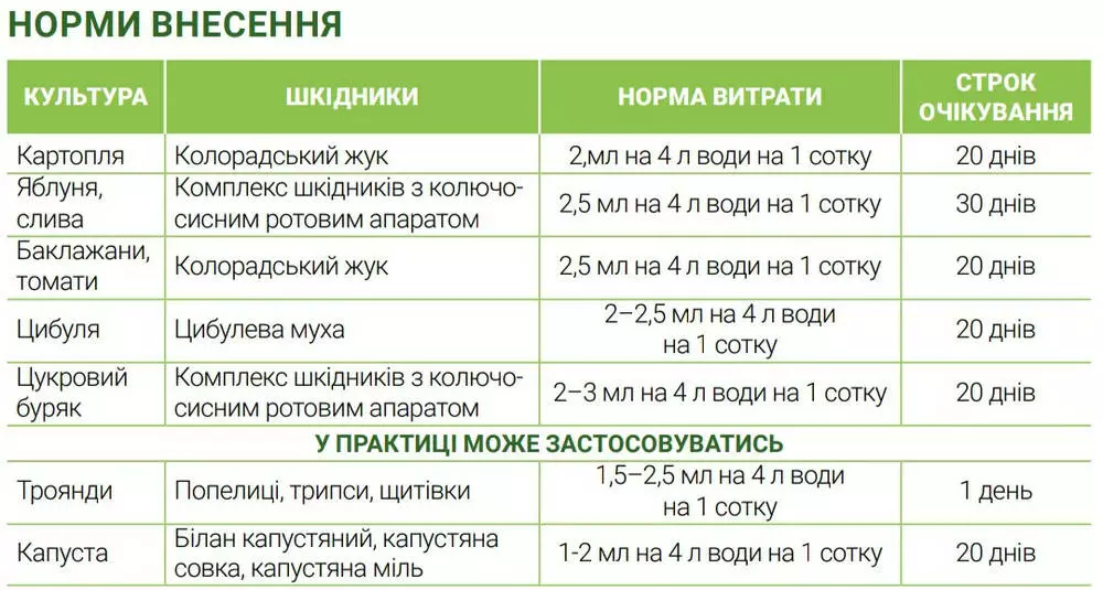 | Картофель | Колорадский жук | 2 мл на 4 л воды на 1 сотку | 20 дней |