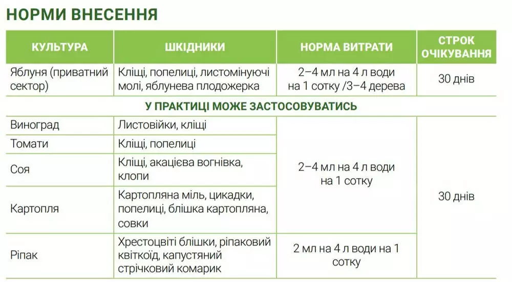 Яблоня (частный сектор) Клещи, тля, листомечущие моли, яблоневая плодожорка 2-4 мл на 4 л воды на 1 сотку / 3-4 дерева 30 дней