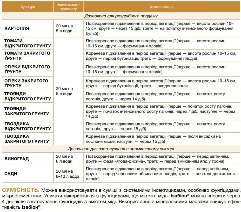 | Виноград | 20 мл на 8 л воды | Внекорневые подкормки в период вегетации (первая - перед цветением, вторая - фаза "ягода-рысина", третья - перед смыканием ягод в гроздья) |
