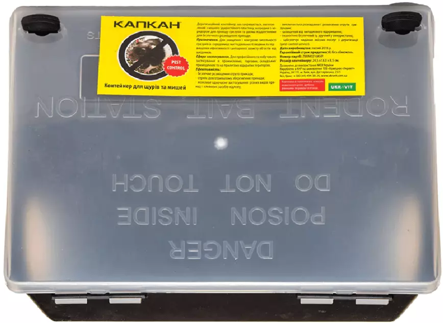 Капкан-контейнеры предназначены для безопасного размещения приманок, которые применяют в борьбе с крысами, крысами, мышами. Пластмассовые контейнеры для дератизации изготовлены из прочного ударостойкого пластика, защищены от случайного открывания, с коридором для прохода грызунов и отверстиями-выходами с обеих сторон. Внутри оснащены металлическим или пластиковым стержнем для фиксации приманки, имеют два отделения для размещения приманки или клейкой пластины.