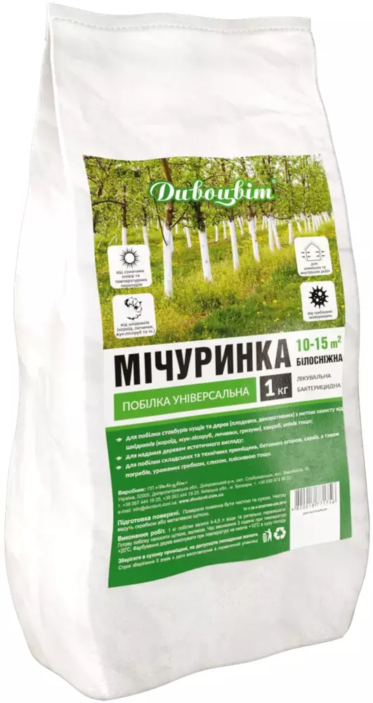 Универсальная побелка для деревьев Мичуринка является хорошим бактерицидным средством для защиты деревьев и кустарников от различных болезней и вредителей.