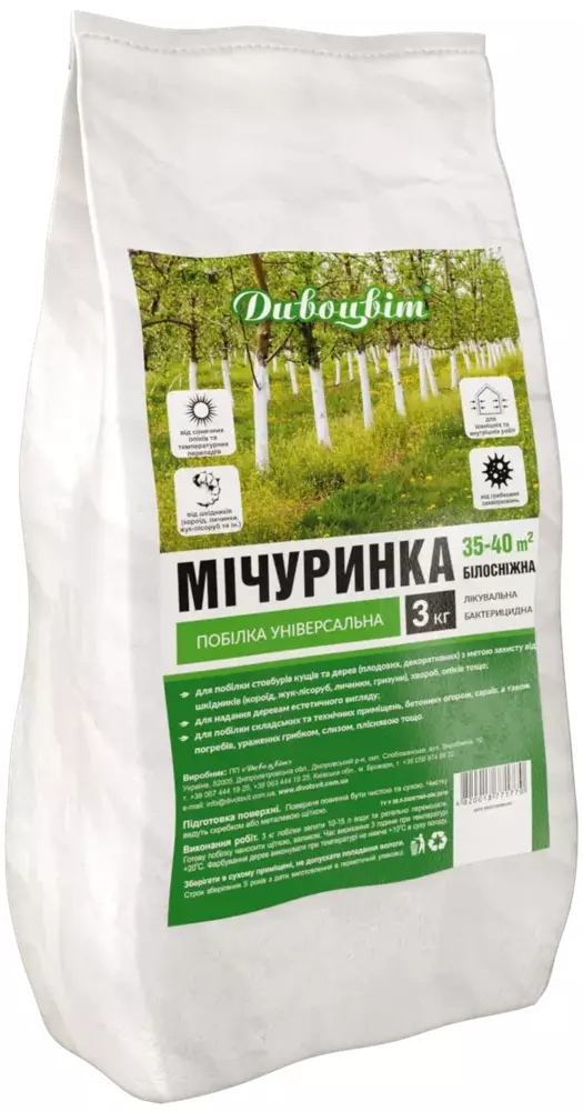 Универсальная побелка для деревьев Мичуринка является хорошим бактерицидным средством для защиты деревьев и кустарников от различных болезней и вредителей.