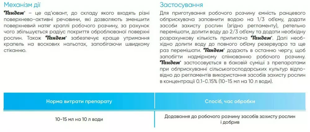 Для приготовления рабочего раствора емкость ранцевого опрыскивателя заполнить водой на 1/3 объема, добавить средства защиты растений (согласно регламенту), тщательно перемешать, долить воду до 2/3 объема и добавить необходимое расчетное количество прилипателя Тандем. Далее необходимо долить воду до полного объема резервуара и еще раз перемешать. Тандем добавляют в последнюю очередь, чтобы предотвратить чрезмерное вспенивание рабочего раствора. Тандем применяется в баковой смеси с препаратами при опрыскивании сельскохозяйственных культур в соответствии с регламентами использования средств защиты растений в концентрации 0.1-0.15% (10-15 мл на 10 л воды).