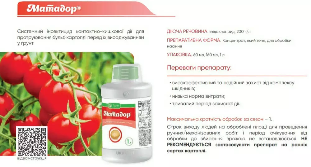 Матадор - Системный инсектицид контактно-кишечного действия для протравливания клубней картофеля перед их высадкой в грунт. Уничтожает почвенных вредителей и предотвращает их развитие и размножение в течение вегетации.