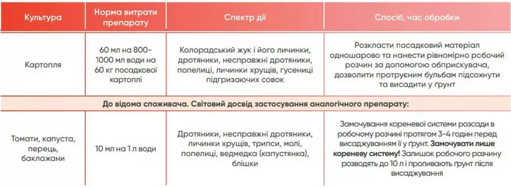 Для приготовления рабочего раствора необходимо 60 мл препарата растворить в 800-1000 мл воды и тщательно перемешать. Этого рабочего раствора достаточно для протравливания 60 кг посадочного материала картофеля. Рабочий раствор необходимо равномерно нанести (с помощью опрыскивателя или другого орудия) на клубни картофеля перед посадкой и тщательно их перемешать, дать возможность подсохнуть и высадить в грунт.