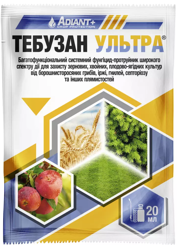 Тебузан Ультра - Многофункциональный системный фунгицид-протравитель широкого спектра действия для защиты зерновых, хвойных, плодово-ягодных культур от мучнисторосяных грибов, ржавчины, гнилей, септориоза и других пятнистостей.