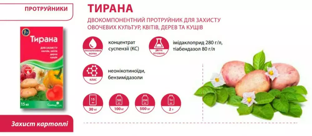 Не секрет, что против поверхностной клубневой инфекции перед посадкой клубни обрабатывают препаратами фунгицидного действия, а против почвенных и наземных вредителей (проволочника, колорадского жука, тли, цикадок - переносчиков вирусных и микоплазменных болезней) - инсектицидами. Обработка двумя отдельными препаратами и самостоятельное формирование баковой смеси имеет достаточно недостатков, среди которых правильность подобранной дозировки, возможность создания баковой смеси (смешивание двух компонентов) и, время, за которое данная смесь формируется и используется. Именно поэтому, наиболее оптимальным решением является использование уже готовых двухкомпонентных рецептурных препаратов, одним из которых является - протравитель Тирана.