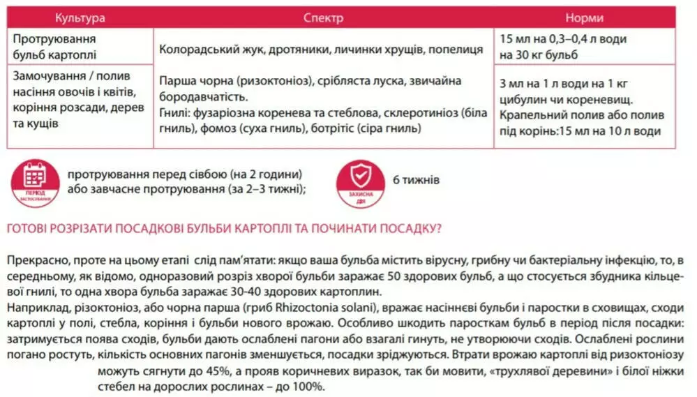 На внутреннюю инфекцию после высева протравленных семян (клубней) в почву действующее вещество начинает действовать уже через 2 - 4 часа. Такая мощная фунгицидная защита позволяет осуществлять посев семян или высадку клубней в более ранние сроки в полной уверенности в устойчивости всходов к неблагоприятным погодным условиям (провоцирующей влаги, чрезмерных дождей и т.д.).