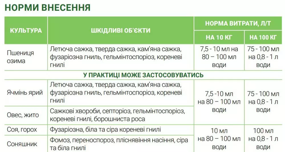| Пшеница озимая | Летучая головня, твердая головня, каменная головня, фузариозная гниль, гельминтоспориоз, корневые гнили | 7,5-10 мл на 80 - 100 мл воды | 75-100 мл на 0,8- 1 л воды |