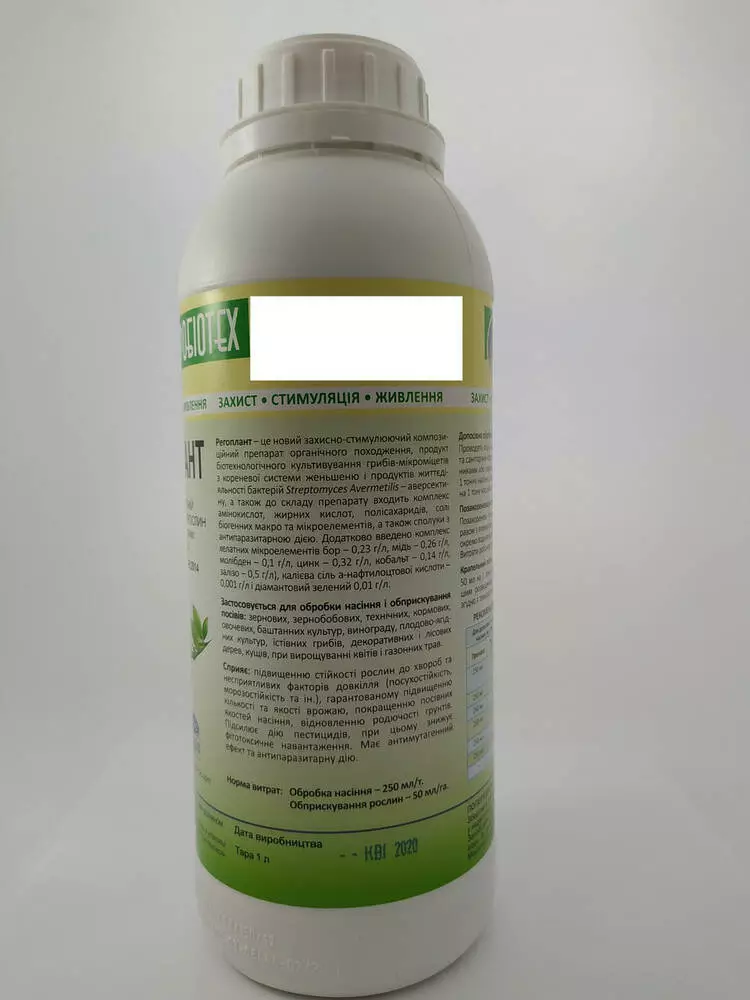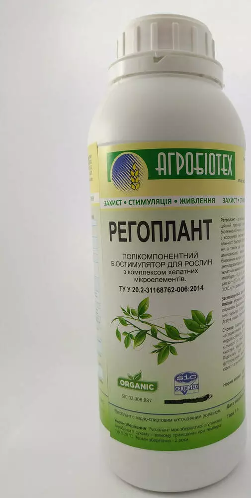 Регоплант- це новий захисно-стимулюючий композиційний препарат органічного походження, продукт біотехнологічного культивування грибів-мікроміцетів з кореневої системи женьшеню і продуктів життєдіяльності бактерій StreptomycesAvermetilis-аверсектину, а також до складу препарату входить комплекс амінокислот, жирних кислот, полісахаридів, солі біогенних макро та мікроелементів, а також сполуки з анти паразитарною дією. Додатково введено комплекс халатних мікроелементів бор -0.23 г/л, мідь – 0.26г/л, молібден – 0.1 г/л, цинк – 0.32 г/л, кобальт – 0.14 г/л, залізо – 0.5 г/л, калієва сіль а-нафтилоцтової кислоти – 0.001 г/л і діамантовий зелений 0.01 г/л.