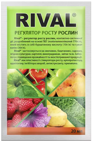 Rival - регулятор роста растений контактно-системного действия, разработанный на основе полиэтиленгликолей (770 г/л), который дополнительно содержит в себе янтарную кислоту (10 г/л) и гумат калия (30 г/л). Препарат стимулирует развитие растений и помогает приспособиться к неблагоприятным явлениям окружающей среды, легче преодолевать их последствия. RIVAL улучшает всхожесть семян и скорость прорастания, усиливает развитие корневой системы, стимулирует рост и развитие растений, повышает иммунитет растений, устойчивость к неблагоприятным погодным условиям (похолодание, заморозки, жара, засуха и др.).
