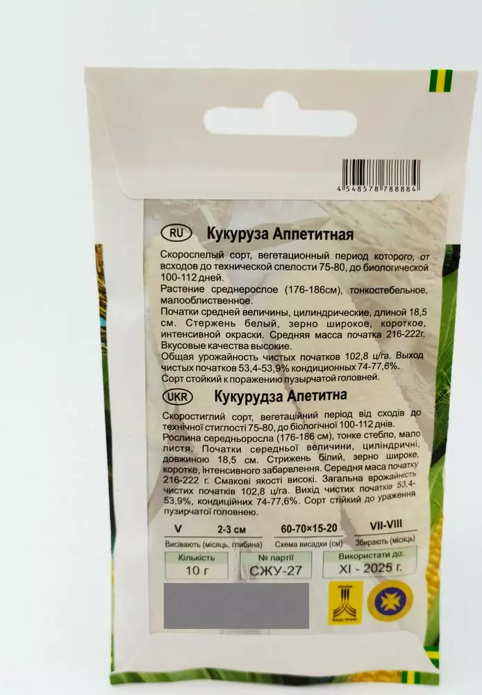 Скороспелый сорт, вегетационный период которого, от всходов од технической спелости 75-80, до биологической 100-112 дней. Растение среднерослое (176-186см), тонкостебельное, малооблиственное. Початки средней величины, цилиндрические, длиной 18,5 см. Стержень белый, зерно широкое, короткое, интенсивной окраски. Средняя масса початка 216-222г. Вкусовые качества высокие. Общая урожайность чистых початков 102,8 ц/га. Выход чистых початков 53,4-53,9% кондиционных 74-77,6%. Сорт стойкий к поражению пузырчатой головн
