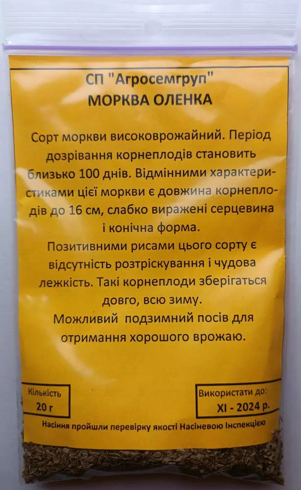 Сорт моркови высокоурожайный. Период созревания корнеплодов составляет около 100 дней. Отличительными характеристиками этой моркови являются длина корнеплодов до 16 см, слабо выраженная сердцевина и коническая форма. Положительными чертами этого сорта является отсутствие растрескивания и отличная лежкость. Такие корнеплоды сохраняются долго, всю зиму. Возможен подзимний посев для получения хорошего урожая.